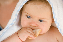 Normalmente se recomienda empezar a comer alimentos no triturados a partir del año de edad, pero el aprendizaje y entrenamiento puede comenzar unos meses antes. La salida de los dientes es un buen momento para ofrecer algún alimento sólido bajo nuestra atenta mirada. Un trozo de pan del día anterior (difícil de fragmentarse) puede suponer un gran alivio para sus doloridas encías.